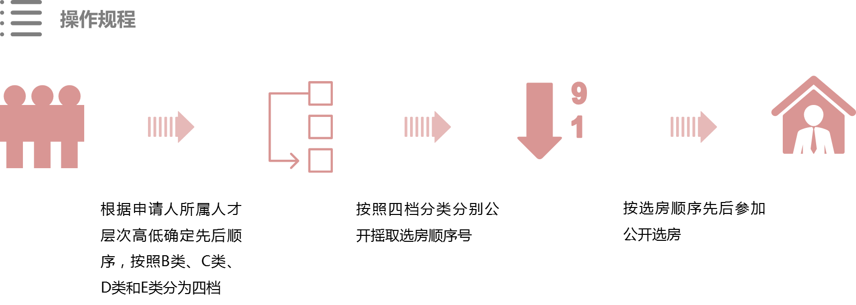 從操作程序上來看,具體工作主要涉及購房登記、住房查詢、信息公示、公證搖號、優先選房、信息鎖定、資格核查七個環節。