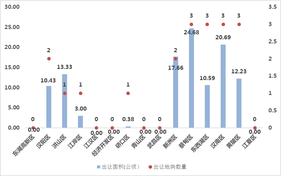 2018年11月,武漢市公開出讓22宗地塊(含1宗工業用地,另21宗均為經營性用地),其中3宗地塊延期,其余19宗地塊均已成交。11月土地出讓面積145.07公頃(約2176.08畝),土地成交面積112.99公頃(約1694.79畝)。