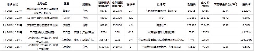 成交價格分析:11月武漢市土地市場共成交19宗地塊,除位于蔡甸區的P(2018)128號地塊為公開招標未設置起始價外,其余18宗地塊中6宗地塊溢價成交,溢價地塊占比為33.33%。6宗溢價地塊中,溢價率低于15%的共4宗,占總溢價地塊的66.67%,均為住宅用地;溢價率高于15%的地塊共2宗,占總溢價地塊的33.33%,均為商服(加油加氣)用地。除商服(加油加氣站)用地外,武漢市溢價地塊溢價率整體較低。