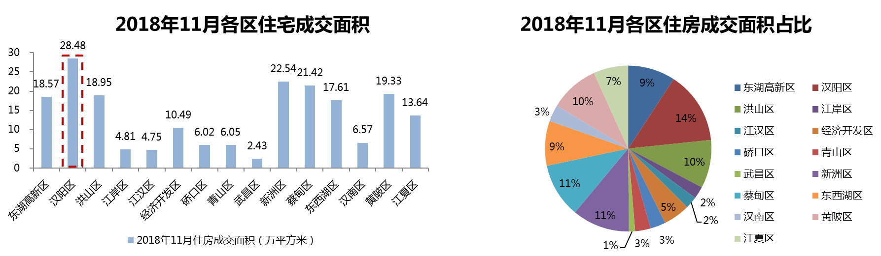 2018年11月房地產(chǎn)市場(chǎng)總成交量為233.59萬(wàn)平方米,其中漢陽(yáng)區(qū)商品房成交量最高,成交面積為31.09萬(wàn)平方米。11月主城區(qū)供應(yīng)量開(kāi)始顯著增加,主城區(qū)總成交量合計(jì)為120.70萬(wàn)平方米,占總成交量51.67%;遠(yuǎn)城區(qū)總成交量合計(jì)112.89萬(wàn)平方米,占總成交量48.33%。
