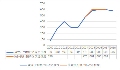 圖2::2009-2018棚改計(jì)劃與實(shí)際改造量(單位:萬(wàn)套)