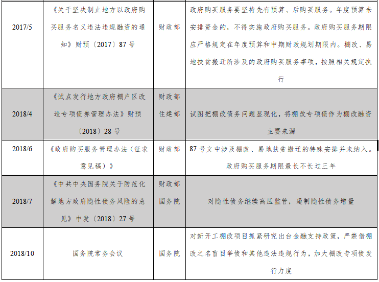 棚戶(hù)區(qū)改造是納入國(guó)家棚戶(hù)區(qū)改造計(jì)劃,依法實(shí)施棚戶(hù)區(qū)征收拆遷、居民補(bǔ)償安置以及相應(yīng)的騰空土地開(kāi)發(fā)利用等系統(tǒng)性工程;一直以來(lái),在國(guó)發(fā)37號(hào)文政策庇護(hù)下,國(guó)家有關(guān)部門(mén)雖然多次出臺(tái)政策,嚴(yán)禁違法違規(guī)或變相增加地方政府隱性債務(wù),但一直都為棚改留下口子。政府購(gòu)買(mǎi)棚改服務(wù)所發(fā)生的超過(guò)中期財(cái)政規(guī)劃的項(xiàng)目融資,實(shí)質(zhì)為增加地方政府隱性債務(wù)之行為。一方面,財(cái)政部87號(hào)文“黨中央、國(guó)務(wù)院統(tǒng)一部署的棚戶(hù)區(qū)改造工作中涉及的政府購(gòu)買(mǎi)服務(wù)事項(xiàng),按照相關(guān)規(guī)定執(zhí)行”視為購(gòu)買(mǎi)棚改服務(wù)的護(hù)身符;另一方面,財(cái)預(yù)28號(hào)文《試點(diǎn)發(fā)行地方政府棚戶(hù)區(qū)改造專(zhuān)項(xiàng)債券管理辦法》的下發(fā),意圖以顯性債務(wù)(棚改專(zhuān)項(xiàng)債)取代隱形債務(wù),但棚改專(zhuān)項(xiàng)債能否真正替代原來(lái)模式解決棚改資金問(wèn)題尚待確定,直到作為層級(jí)最高的綱領(lǐng)性文件中發(fā)27號(hào)文出臺(tái),政府購(gòu)買(mǎi)棚改服務(wù)形成的債務(wù)屬于典型的政府隱性債務(wù)而受此文管控;且10月28日召開(kāi)的國(guó)常會(huì)針對(duì)棚改,明確提出“嚴(yán)禁借棚改之名盲目舉債和其他違法違規(guī)行為”,該會(huì)議要求加大棚改專(zhuān)項(xiàng)債發(fā)行力度,鼓勵(lì)棚改專(zhuān)項(xiàng)債這類(lèi)顯性債務(wù)融資工具作為棚改主要資金來(lái)源,且有針對(duì)性地研究新的金融支持政策。這就進(jìn)一步終止了87號(hào)文作為政府購(gòu)買(mǎi)服務(wù)的護(hù)身符。