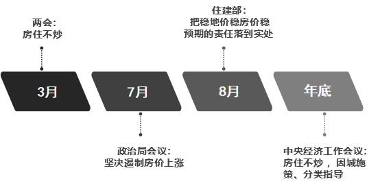 2018年是政策調(diào)控頻出的一年,中央堅持“房住不炒,因城施策”的政策主基調(diào),全國各地城市政府從“限購、限貸、限售、限價”四限來落實穩(wěn)房價、控租金,降杠桿、防風險,調(diào)結(jié)構(gòu)、穩(wěn)預期的目標任務(wù)。2018年3月,兩會再度重申“房住不炒”;7月,政治局會議從“遏制房價過快上漲”升級為“堅決遏制房價上漲”;8月,住建部提出把穩(wěn)地價穩(wěn)房價穩(wěn)預期的責任落到實處;年底的中央經(jīng)濟工作會議提出,要構(gòu)建房地產(chǎn)市場健康發(fā)展長效機制,堅持“房住不炒”的定位,因城施策、分類指導,夯實城市政府主體責任,完善住房市場體系和住房保障體系。