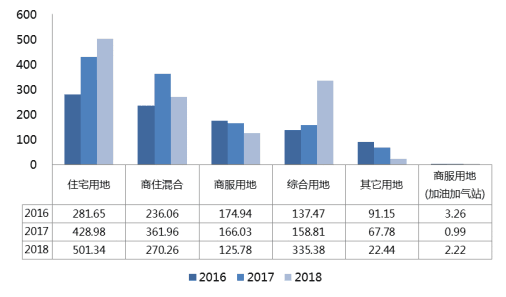 2. “房住不炒”戰(zhàn)略下住宅用地持續(xù)增長,受庫存影響商服用地供應(yīng)連續(xù)下降,綜合用地持續(xù)增長表明搭配出讓逐步成為主流出讓方式。