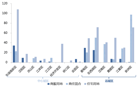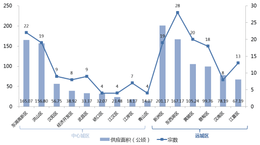 遠城區(qū)的處于城市發(fā)展的基礎(chǔ)階段,各類用地供應(yīng)都較大,其中商住混合用地約占武漢市整體該類用地供應(yīng)總量的85%,住宅用地約占武漢市供應(yīng)總量62.60%;新洲區(qū)全年供應(yīng)19宗土地,總面積達201.17公頃(3017.62畝),位列武漢市土地市場第一位;東湖高新區(qū)和經(jīng)濟開發(fā)區(qū)是中心城區(qū)住宅用地供應(yīng)的主力,可以預(yù)見這兩個地區(qū)及遠城區(qū)會成為人口導(dǎo)入的主要區(qū)域。