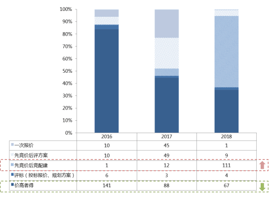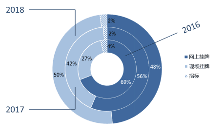 2018年土地供應(yīng)依舊以掛牌為主,其中采用現(xiàn)場掛牌的共95宗土地,約占全年供應(yīng)總量50%;網(wǎng)上掛牌共93宗,約占總量48%;采用招標方式出讓的共4宗,僅占總量2%。近三年采用網(wǎng)上掛牌的土地數(shù)量逐年縮減,現(xiàn)場掛牌數(shù)量增多,原因可能是在于土地市場的競買規(guī)則升級,現(xiàn)場競配建成為一種趨勢。