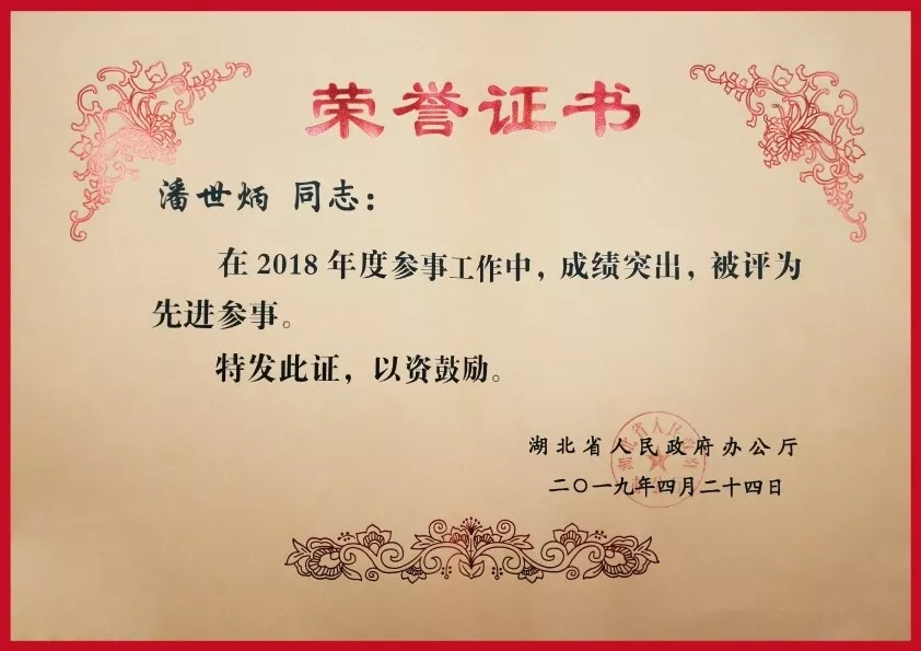 永業(yè)行董事長兼總裁、省政府參事潘世炳獲得先進(jìn)參事獎、參政建議一等獎和支持參事工作獎等三個獎項(xiàng)。辦公廳要求獲獎人員保持榮譽(yù),發(fā)揚(yáng)成績,奮力譜寫新時代湖北高質(zhì)量發(fā)展新篇章。