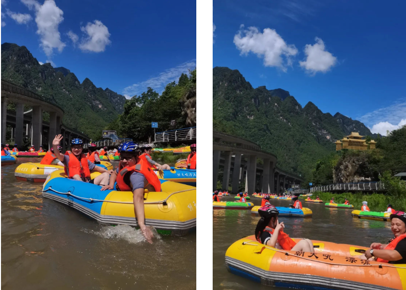河流時而湍急時而平緩,漂流似乎喚起了大家的童心,河道中順著水流你追我趕,一旦在平坦處“相撞”少不了要一場戲水激戰,船上伙伴兩兩合力,控制著船只瘋狂反擊,激流的呼喊聲與相撞的“戰斗聲”響徹山谷,飛濺的流水浸透了衣服,大家卻感到更加快樂。此刻,是同事,更像朋友兄弟,所有伙伴都深刻體會到了獨木不成林,團結才是力量的道理。