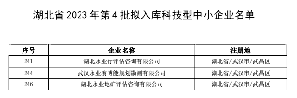 近日,湖北省科技廳公布湖北省2023年度入庫科技型中小企業名單,永業行成員機構湖北永業行評估咨詢有限公司、武漢永業賽博能規劃勘測有限公司、湖北永業地礦評估咨詢有限公司位列其中。