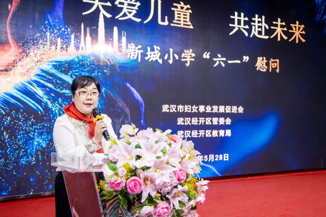 武漢經開區教育局黨委書記、局長熊白莉上臺致辭。她指出,武漢市婦女事業發展促進會與各位市老領導來到經開區新城小學開展捐贈慰問活動,充分展現了對經開區教育工作的厚愛和對孩子們健康成長的期望。希望新城小學以此次活動為新起點,落實好立德樹人根本任務,繼續秉承“快樂童年 多彩人生”的辦學理念,用好捐贈的教育資源,將足球這一辦學特色發揚光大,用優秀的辦學成果回饋各級領導和社會各界的關心支持。