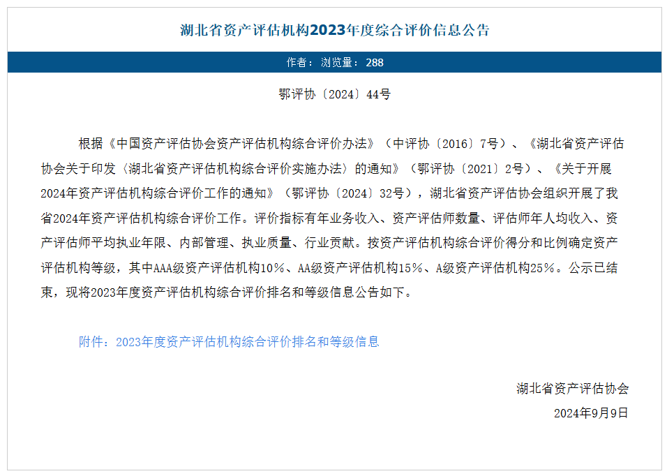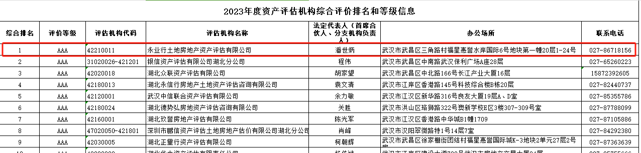2024年9月9日,湖北省資產評估協會發布2023年度湖北省資產評估機構綜合評價榜單,永業行憑借卓越的服務質量和執業水平,榮膺“AAA級資產評估機構”,位列湖北第一。