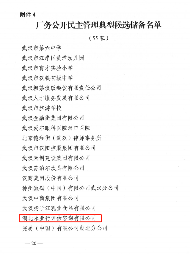 近日,武漢市總工會發布了關于2022-2024年度全市基層工會工作自查暨2024年全市企事業單位民主管理自查情況的通報,對湖北永業行評估咨詢有限公司等55家廠務公開民主管理典型單位予以通報表揚,并列入下一步向全總、省總推薦的廠務公開民主管理典型的候選單位。