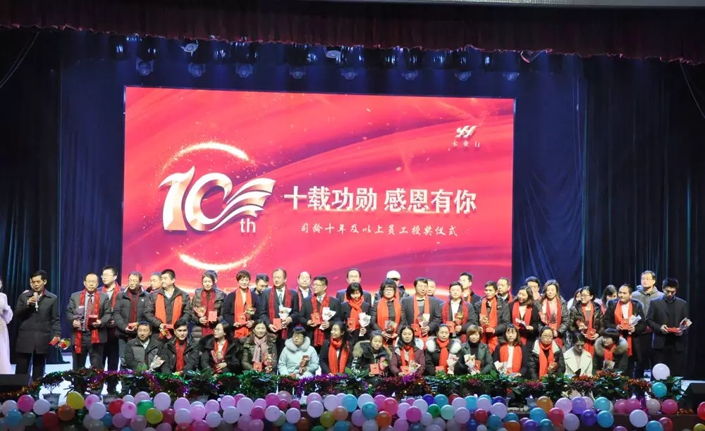 永業行成長至今,離不開一直默默付出的員工們。本次年會將走心進行到底,特別設置了“十載功勛 感恩有你”環節。凝聚永業行人心聲的視頻短片《十年芳華 不忘初心》,讓現場觀眾無限感動、一度哽咽。59名十年及以上的員工依次登臺,董事長方國成、總裁潘世炳為各位老員工頒發了十年勛章及鮮花,希望他們能與永業行挽手同行,再創輝煌。
