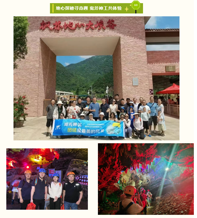 抵達楓林地心谷景區,大家換上防水雨靴、頭盔深入溶洞開啟探險之旅。18℃的恒溫洞穴內別有洞天,潺潺流水沿巖壁蜿蜒而下形成天然溯溪路徑,水滴擊石的清脆聲響與鐘乳石的奇特造型相映成趣,大家在溯溪前行中直呼涼快。團隊成員手挽手小心跨越濕滑步道,不時彎腰避開低垂的巖縫,家長則緊牽孩子的手耐心講解鐘乳石的形成原理。行至開闊處,大家駐足觀賞“石幔垂掛”“石柱林立”的奇幻景觀,用手機記錄下自然造物的鬼斧神工,孩童們的驚嘆聲與大人的講解聲在溶洞中輕輕回蕩,互助前行的身影成為洞內最美風景。