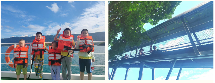 7月20日清晨,團隊乘船游覽仙島湖,碧波蕩漾的湖面送來陣陣清爽,形態各異的島嶼構成天然畫卷,湖面清涼的微風拂去暑氣,讓人心曠神怡。全員身著救生衣有序登船,家長將孩子護在懷中,共同聆聽導游講解 “望仙崖”“觀音洞” 等景點的傳說故事,親子間的溫馨低語與驚喜贊嘆交織成動人風景。