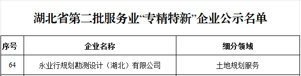 近日,湖北省發(fā)改委公示湖北省第二批服務(wù)業(yè)“專精特新”企業(yè)認(rèn)定名單,永業(yè)行旗下“永業(yè)行規(guī)劃勘測設(shè)計(湖北)有限公司”成功獲評。